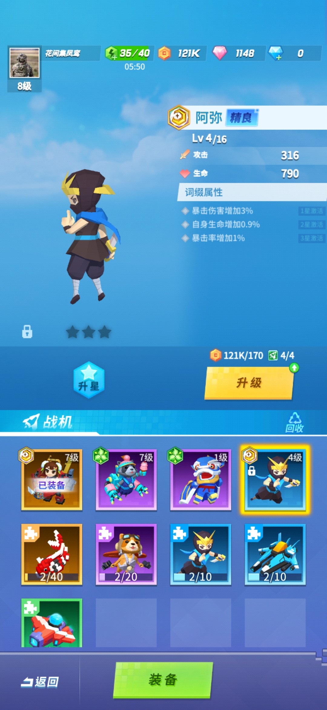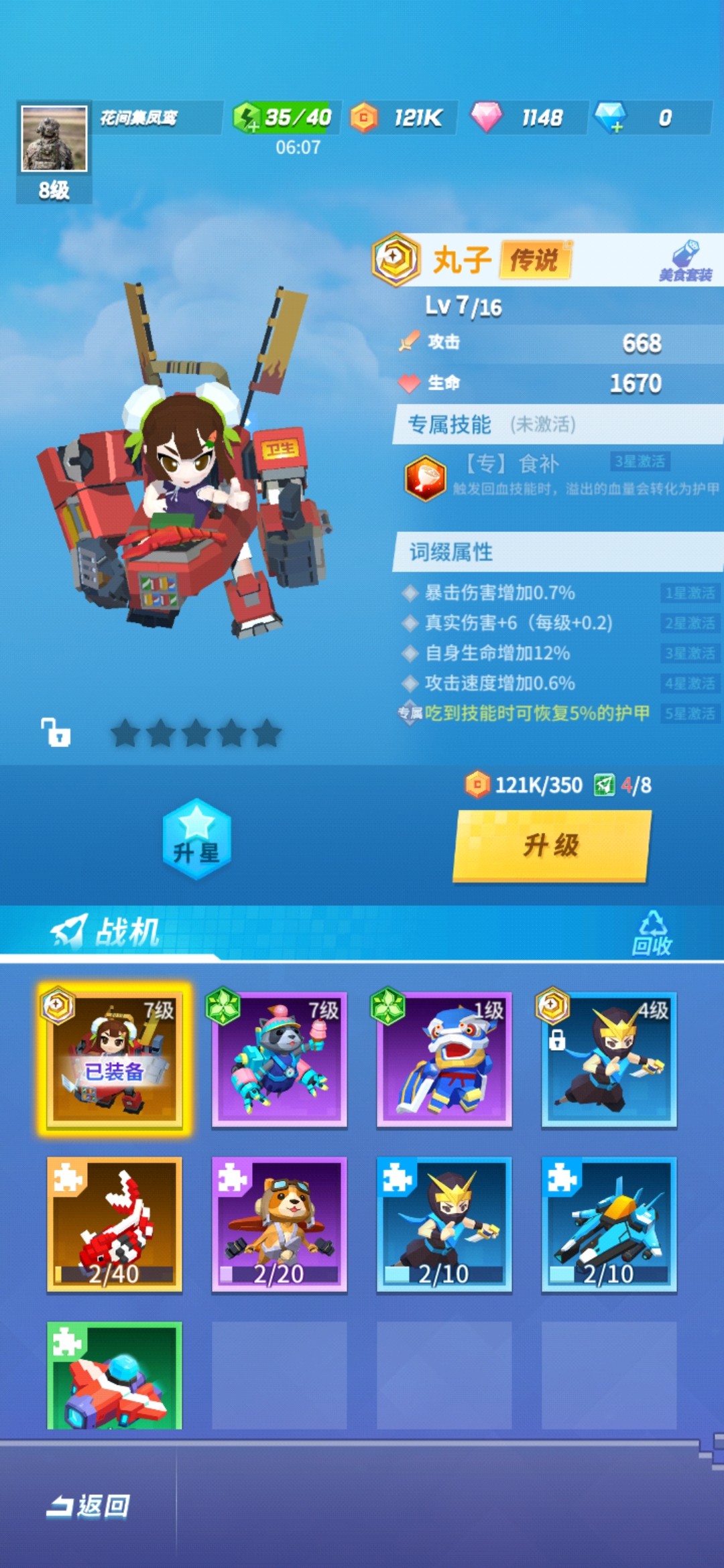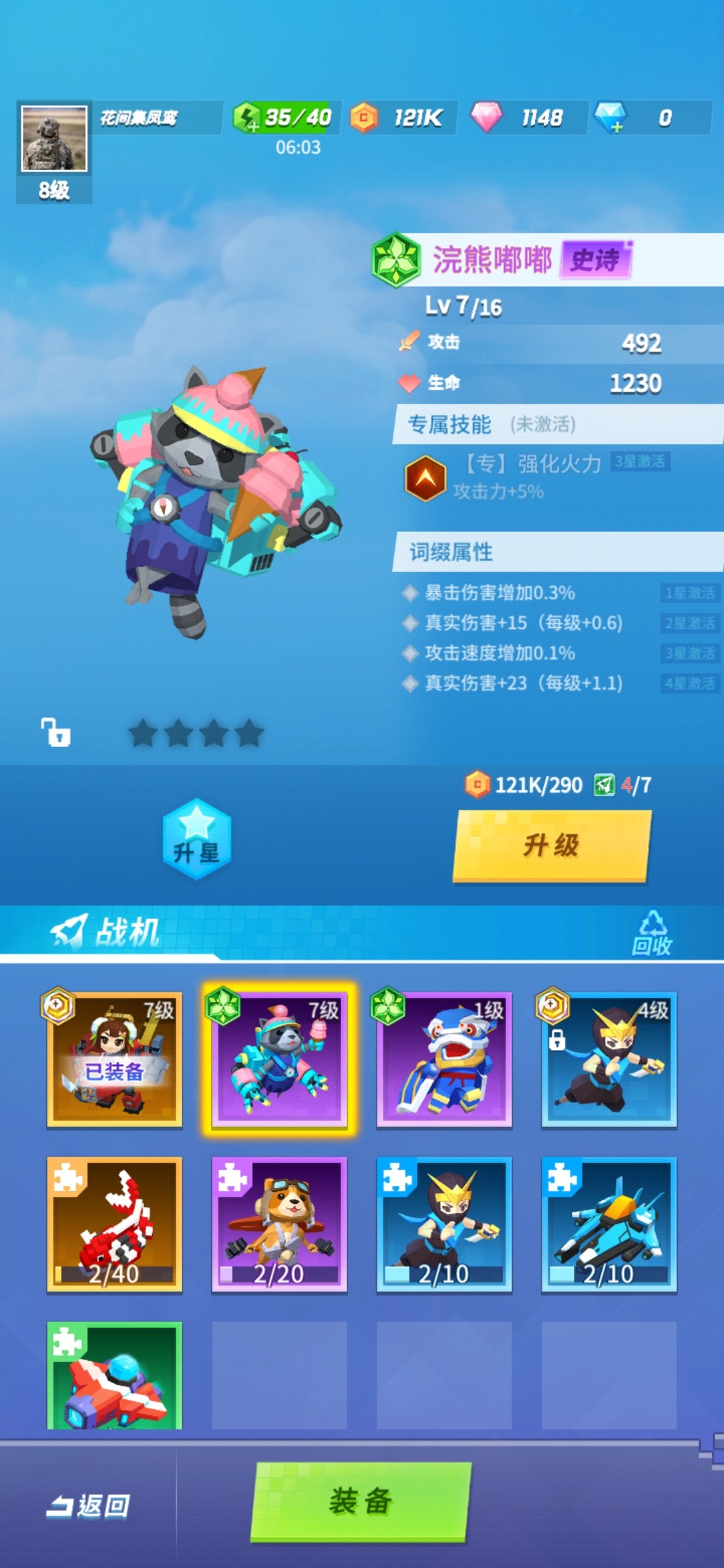 接着我们来看看激活战机技能,可以激活技能的战机是紫色史诗级别战机角色和橙色传奇级别的战机角色。想要激活这些战机的角色技能就需要我们升级战机角色的星级,升级星级就需要同名战机的碎片,紫色的战机我们可以通过任务和扭蛋获取,传奇战机我们只能通过攒钻石慢慢抽扭蛋获取。当我们获取了足够的战机碎片之后就可以给战机升级,当战机达到三星的时候就可以激活角色技能了!