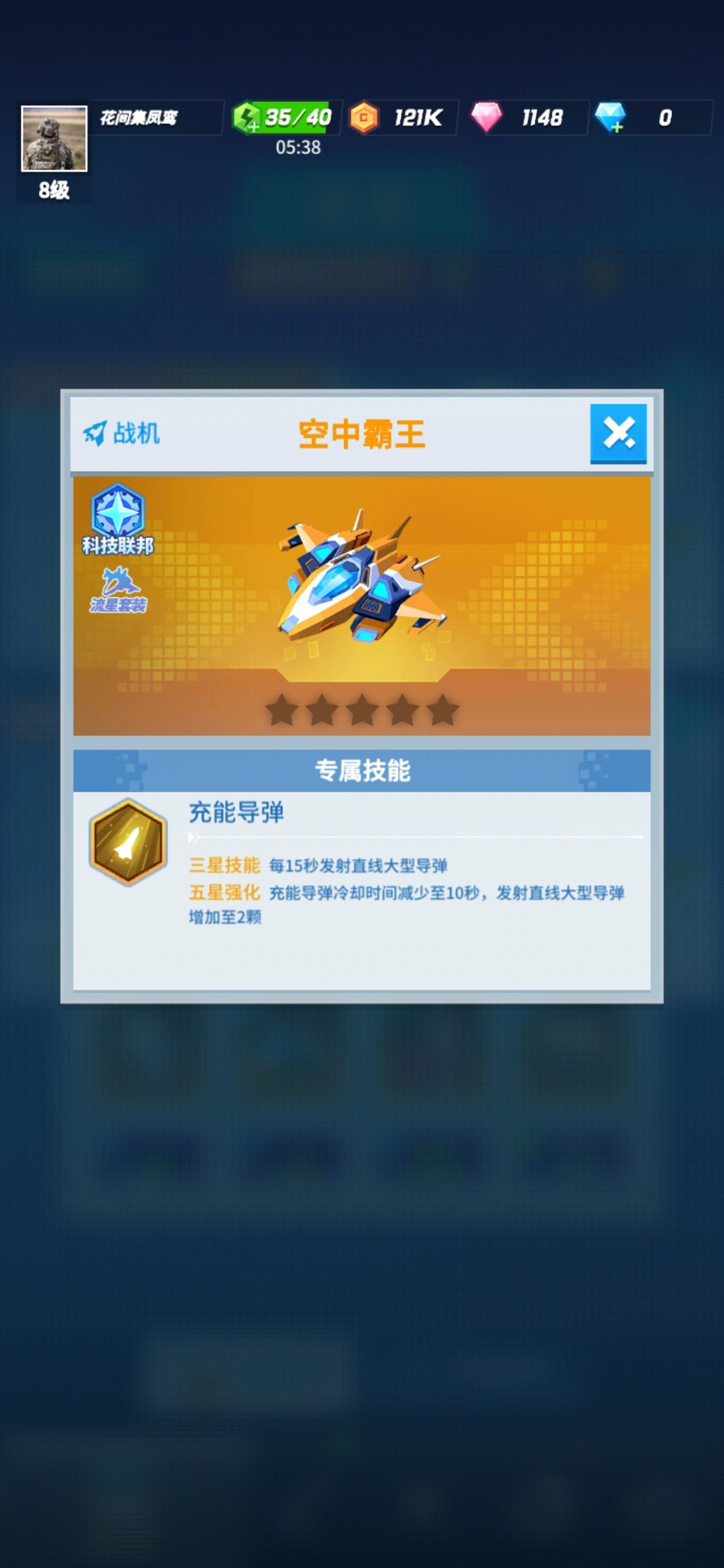 而同样是橙色战机的空中霸王,在三星和五星的时候会有两个不同的技能:三星的时候激活的技能是:每15秒发射直线大型导弹;五星的时候激活的技能是:充能导弹减少10秒能却,发射直线大型导弹数量变为2颗。