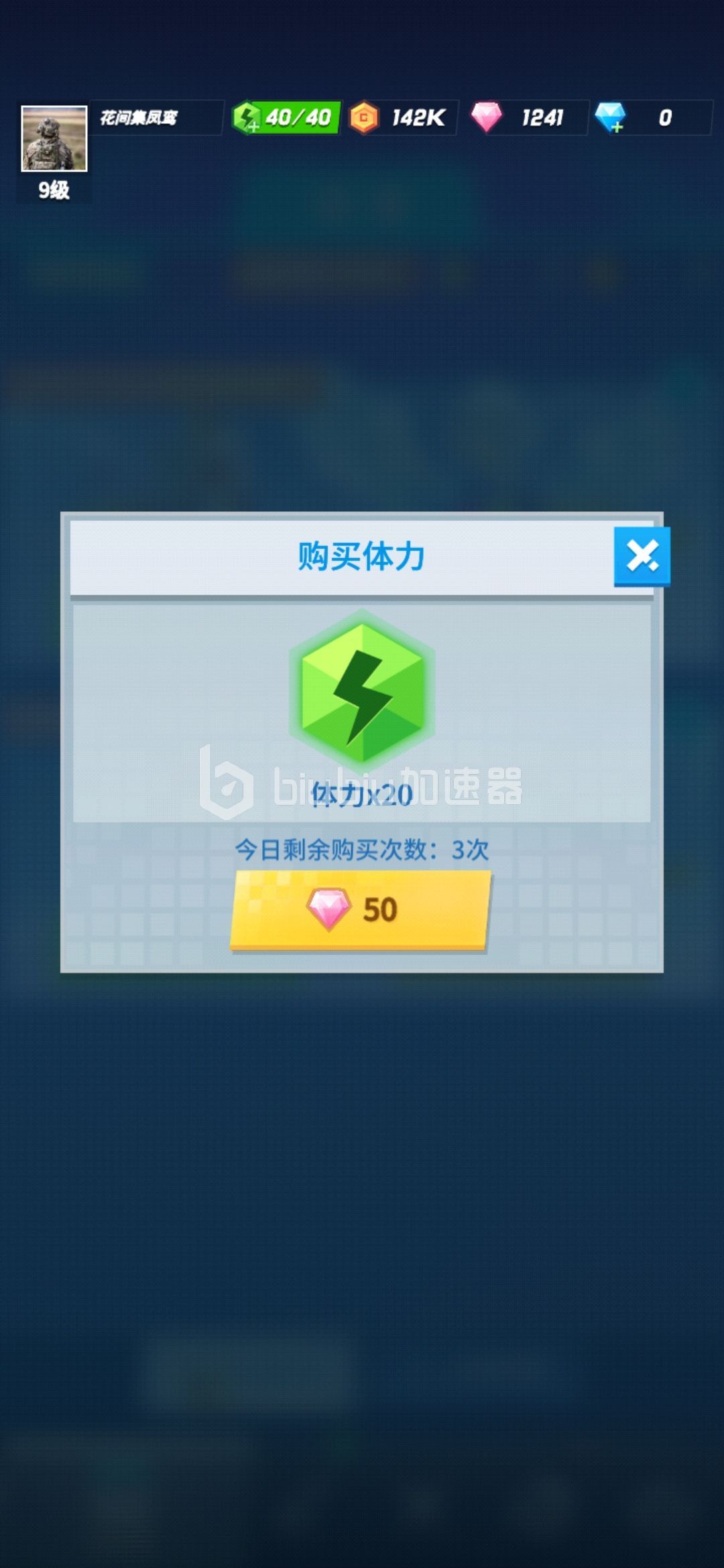 购买体力:我们可以点击上方的绿色体力标志,这样每天我们就可以通过50粉钻购买20点体力,但是有购买限制是3次,因此每天我们可以额外获得60点体力。