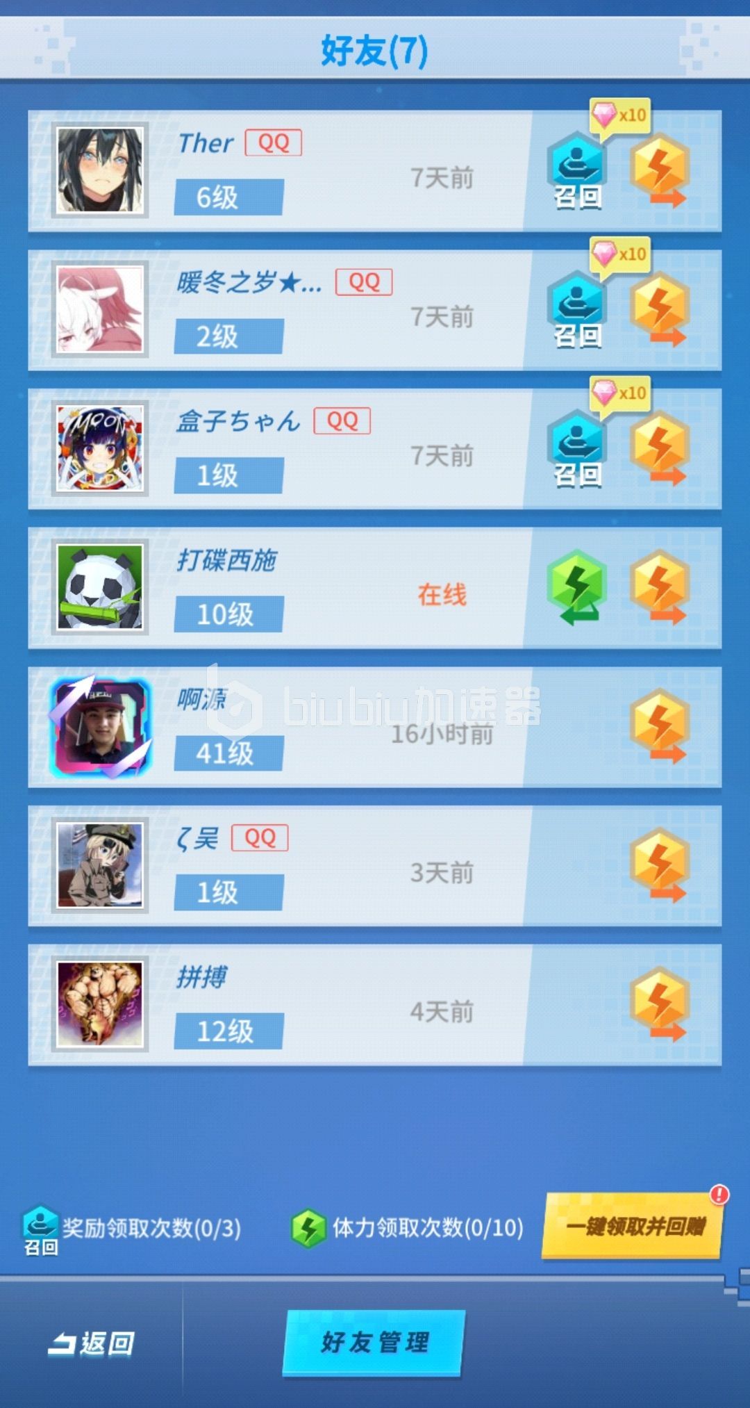 好友赠送:当我们有足够多的活跃好友的时候,我们可以在好友界面每日给好友进行赠送,同样我们也可以领取好友赠送的给我们的体力,每天的领取上限时10个,因此我们可以多加一些活跃的好友来每天活得免费的体力!