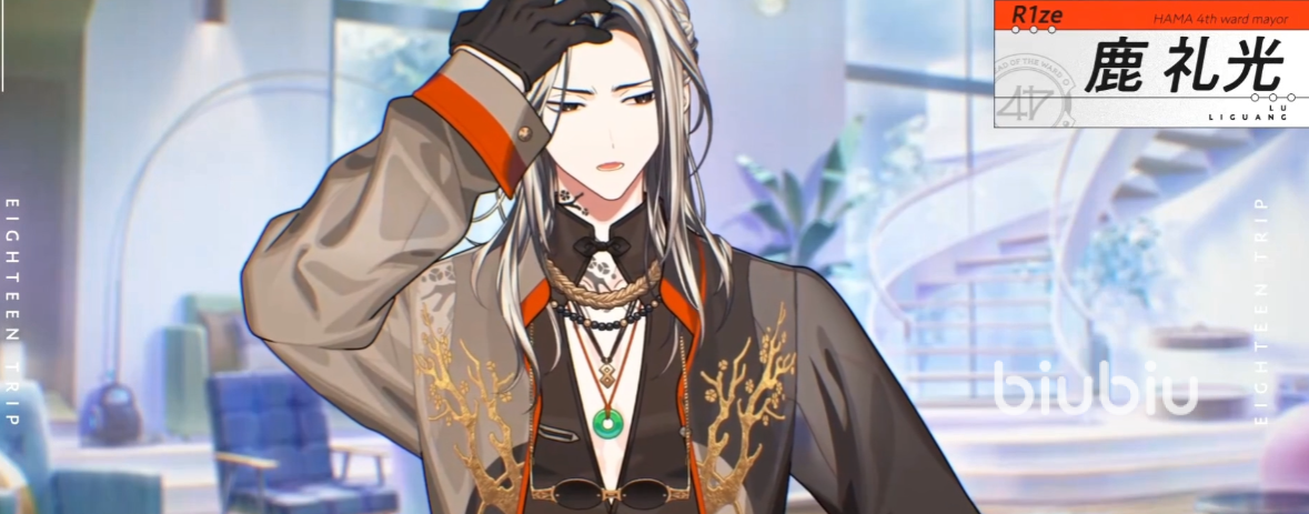 鹿礼光是目前在18TRIP游戏中唯一一位与中华有关的角色,他是HAMA4区的区长,同时也是一位年轻有为却又老练无情的中华黑手党成员。明面上鹿礼光的身份是一个名为【兔角】的公司的董事长,据点是HAMA地区的中华街,以及中华街周边一带。在游戏剧情中,鹿礼光常常能够解决一些没有办法正大光明结局的问题,也因为这一重身份,玩家们和鹿礼光在一同开展HAMA4区的旅游业时,获得了许多意料之外的助力。鹿礼光出生于HAMA的名门望族之一——鹿茸,同时也是鹿茸家族新生一代最有能力的一位,他有着能够让所有魑魅魍魉服从的威压感,以及能够看破事情本质的超强洞察力,因为自身非常有能力,所以会排斥没有实力的人。