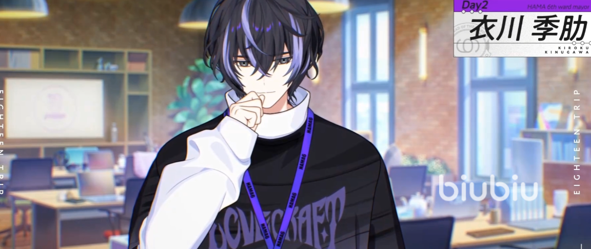 衣川季肋的性格确实和外表看上去那样腼腆,虽然拥有着极为美貌的脸,但性格并不张扬,反而很老实。他的年龄是十六岁,出生于二月十九日,身高是滨明日桧高中同届二年级学生中最高的,能够达到180厘米。从很小的时候开始,衣川季肋就展现出了非常不错的绘画天赋,在家人的支持下,衣川季肋开始沉醉于传统形式的绘画,这里所指的传统绘画并不是如今流行的使用数位板电脑等数字化的工具,而是完全使用传统的纸笔颜料进行创作。对于衣川季肋名字中的“肋”,他的解释是“想象的世界,就是我的肋骨”。在游戏中,他将作为HAMA6区的区长与玩家们相遇,所在的队伍是Day2。