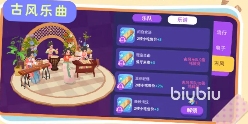 二楼还有婚礼宴会,大家可以根据不同的选择来打造出适配的舞台,让婚宴更加出彩,同时还可以安排乐队表演,表演可以选择古风、摇滚、电子三种不同的风格,进行多个乐曲表演,带来不同餐厅加成。