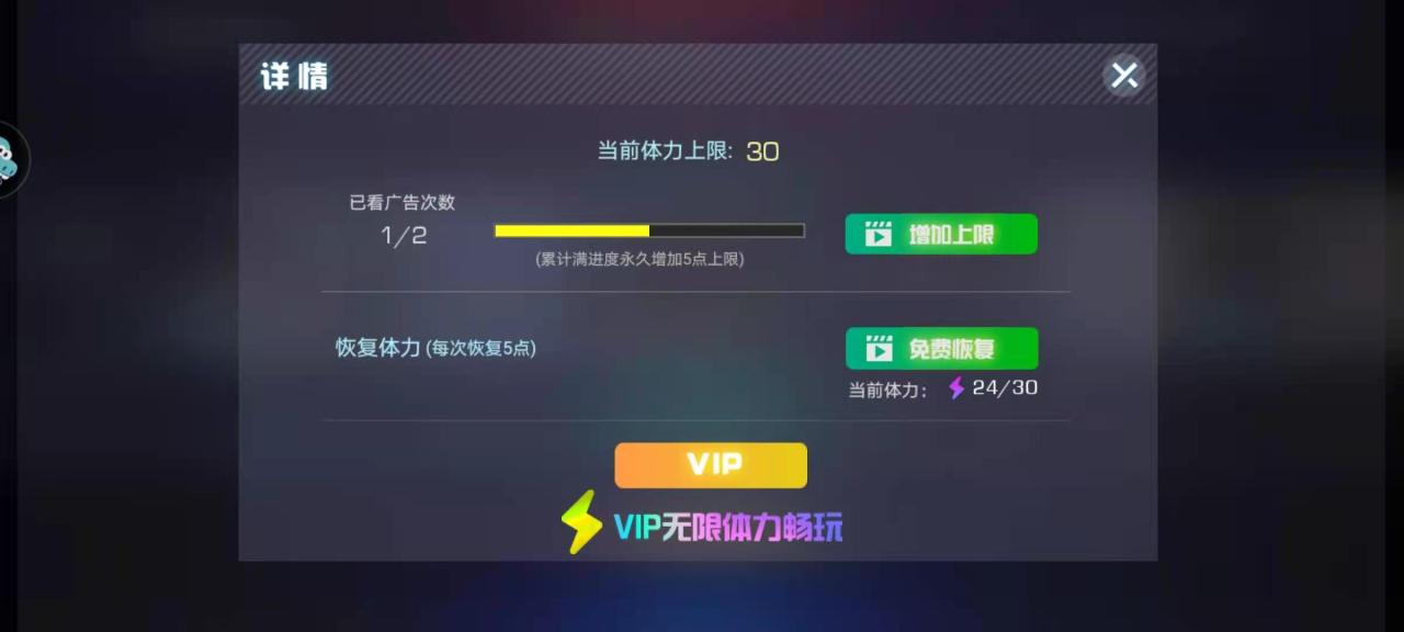 第二个方法是看视频,也就是通过看广告来给我们游戏重新增加体力值,这个从我们闪电图标后面的加号里进入,看一次广告能够加五个体力值,也就是等于一首歌一次广告。这个还是算很实用了,就是耗耐心,但是广告除了单纯加体力,还能用看广告来进行增加体力上限,这个和前面第一个方法一起用,实用值算能够大大提升了。