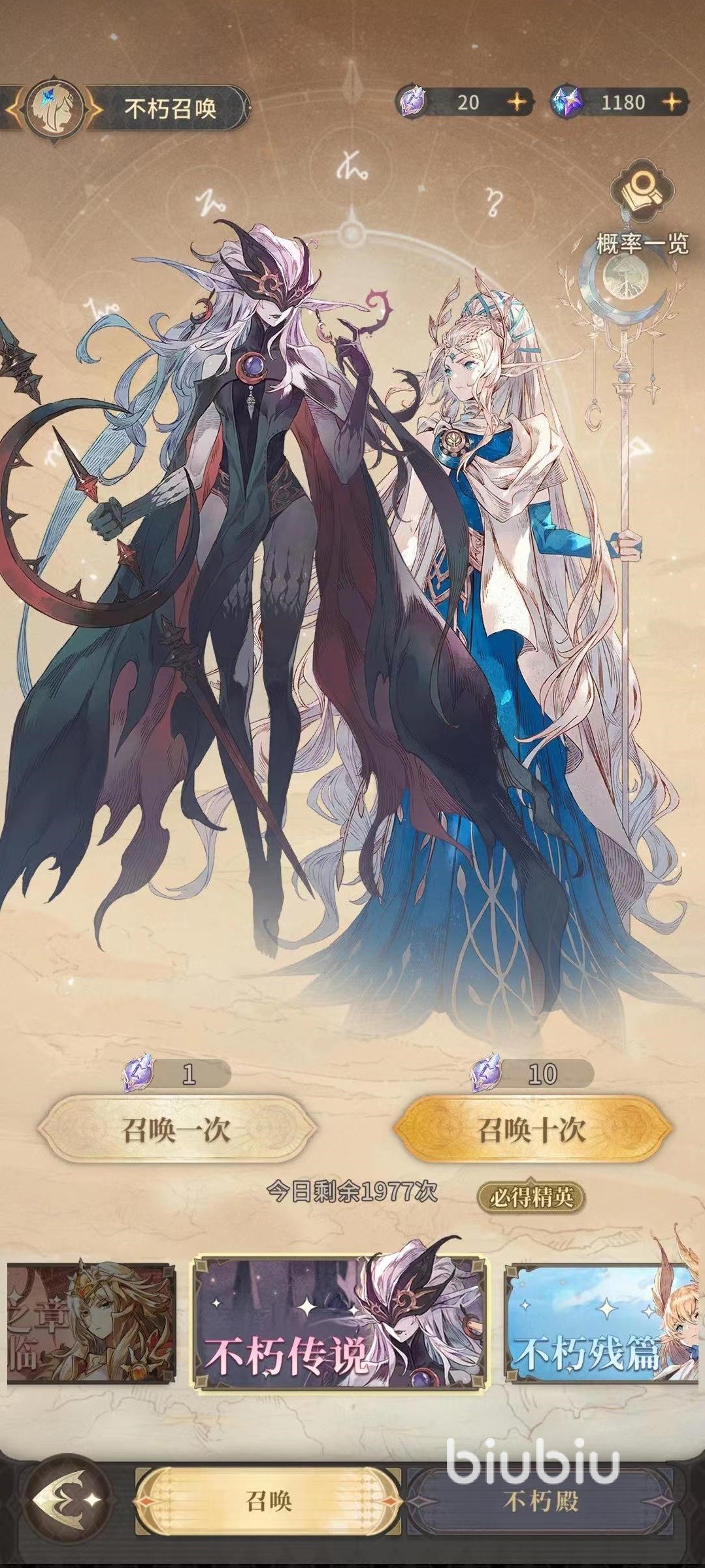 接下来就是卡牌游戏的核心抽卡,需要在不朽店中利用钻石去召唤,不朽者分为普通池、常驻池和up池。这些都是使用水晶或是钻石进行连抽,这里小编是不建议使用钻石抽普通池或up池,因为保底需要50发才能出金,对钻石来说非常浪费,对不朽者带来战力增长也不是非常明显,所以性价比较低。但也有例外情况,如果只差很少的阶段就能达到不朽期盼,也可以投入一些钻石尝试。真正值得投入的是去群星之轨抽取,每天只能使用钻石抽取两次10连,100抽保底必定会出现。这里给予的四技能不朽者作用极大,对战力提升非常明显。除了此之外还能够抽出9999钻石、自选超凡角色等。