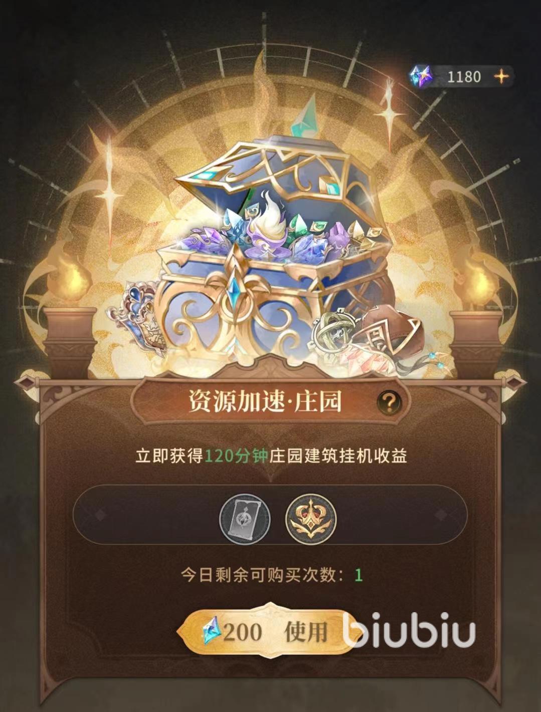 然后是用在庄园里的资源加速庄园每天可以获得资源,利用钻石加速后能获取更多,200小时就可以获得两小时的挂机收益,前期非常推荐使用,因为此时钻石较多而使用的地方却并不多而开荒是最需要资源的地方,利用庄园获取的这些资源,能帮助大家更好地进行推图,实现良性循环。庄园建筑中的圣泉也是角色升级经验的重要来源,前期等级快速提升带来战力标准。如果到了游戏后期,挂机获得资源也是很重要的方式。