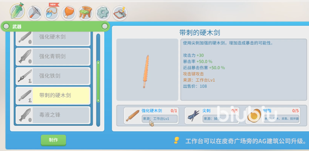 剑是前期玩家们在面对怪物时最好用的武器,因为它的使用手感并不沉重,每一次挥击的动画也不拖沓粘滞,玩家们可以从中感觉出刀刀致命的意思。虽然每一次挥剑的伤害不是特别高,但考虑到它每段攻击之间间隔的时间不久,且有一个【二连斩】的效果,有着打断当前怪物攻击动作的功能,无论是想要用来格挡还是进攻都非常好用。玩家们获得的第一把剑类武器是木剑,即使是最低级的木剑,也能够产生暴击效果,对怪物们造成暴击伤害和暴击效果。如果玩家们决定选择剑作为自己的主武器,那么只需要将工作台升至2级就能制作出最高级的青铜剑。