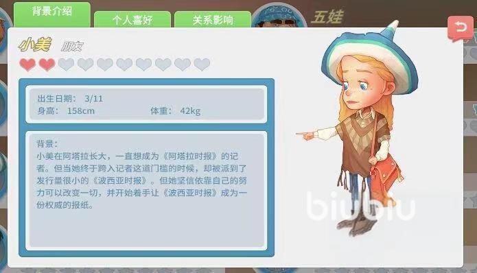 喜好礼物:小美对与报社工作相关的物品特别感兴趣,如摄像机、报刊等。此外,各类宝石也是不错的选择,特别是红宝石、蓝宝石、黄宝石等。这些礼物可以显著提升她对玩家的好感度。