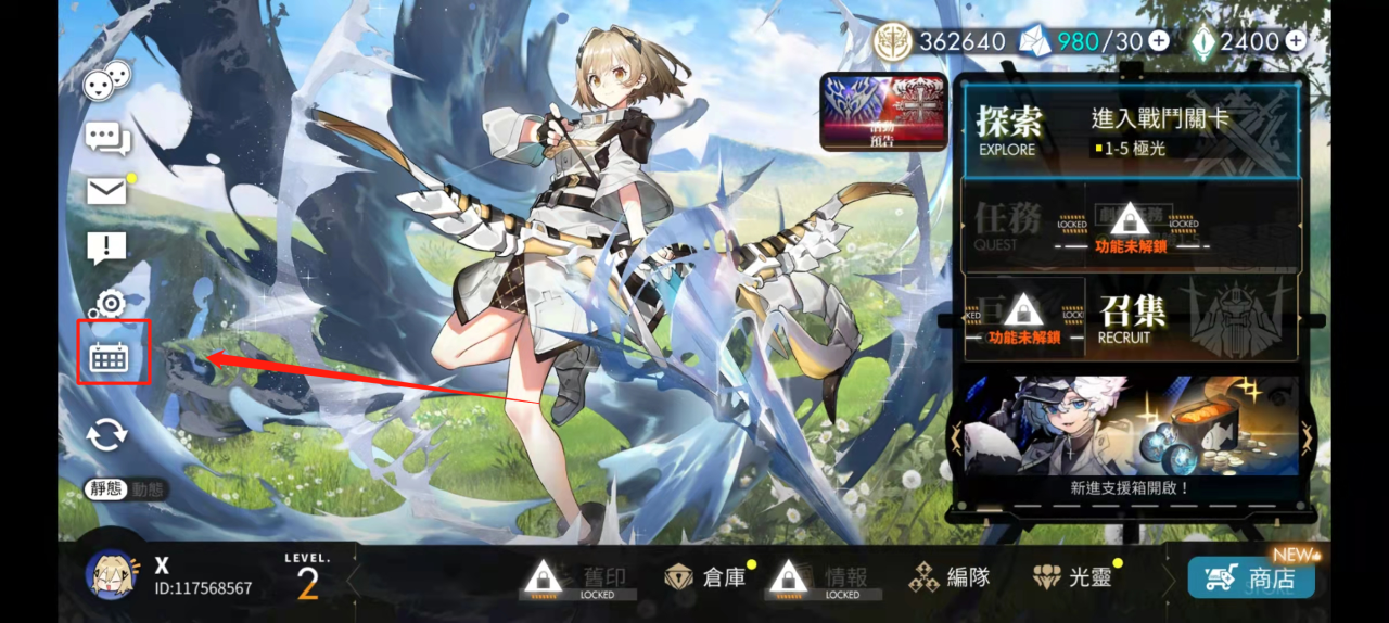 2、在游戏的主页面位置,点击左侧类似日历的东西,可以继续查看当期的签到奖励,小编会在图中为大家标注出来。