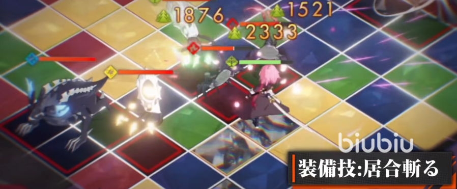 大招居合斩:在提升了格子的属性之后,可以获得居合效果,可以瞬间让你的攻击力提升到百分之一百三。等到玩家三次觉醒之后,可以在每一个回合中使用一次居合斩,从而获得更强的攻击力。尤其在进阶后可以增加生命值和抗性,还可以让自己的主动技能得到进化。