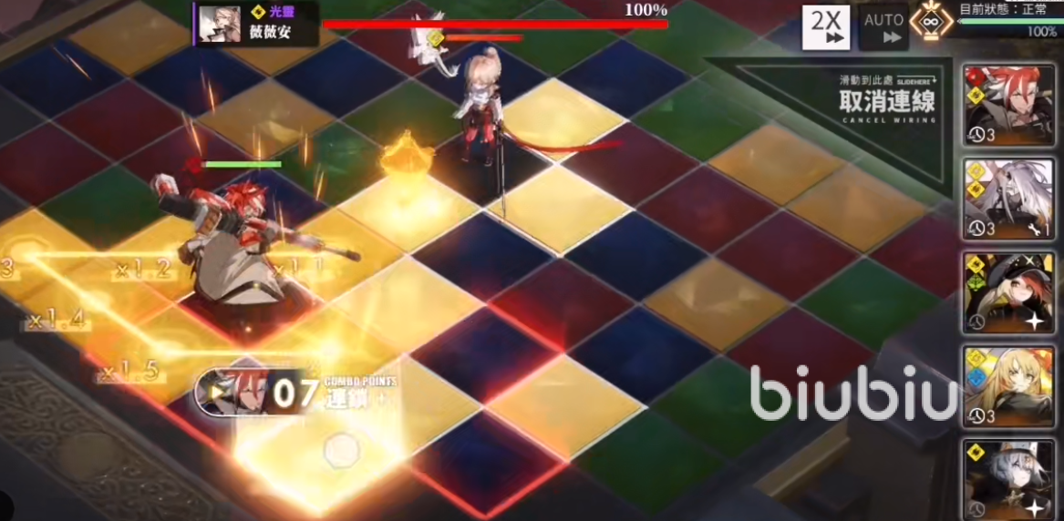 连锁技能:机甲震撼术。连锁5格,对应纵向打一次全列伤害;连锁9格,对三列造成全列伤害;连锁13格,范围攻击3列全体敌方,伤害是攻击力的1.4倍率。连锁技能与装备技能联动,尽可能扩大打击的范围,可以使麻痹效果达到最佳。