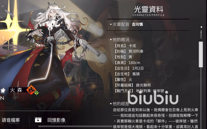 卡戎自称是是无河列车的售票员与摆渡人,喜欢听摇滚音乐搭载彼岸号在隧道风驰电掣,他的伙伴列车拥有灵性,在技能里能够召唤列车进行大范围攻击。