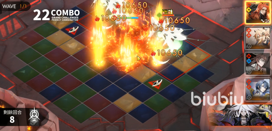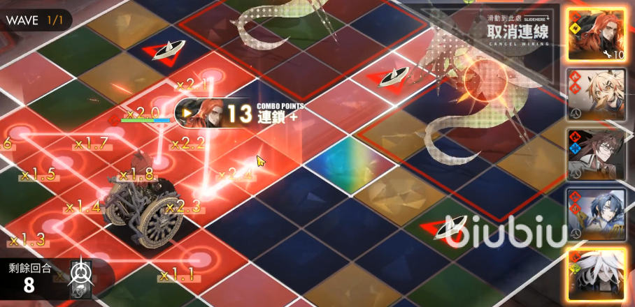 连锁技能:连锁2格对周围一圈的格子造成一次伤害。连锁9格对米字方向16格的格子造成一次伤害。连锁12格,对周围两圈格子造成一次伤害,连锁的伤害倍率随着格数提升到最大1.8倍。在对局中,比较建议先用卡戎作为队长,如果需要切换队长,建议醒山放在尾,把醒山与卡戎对调来用。