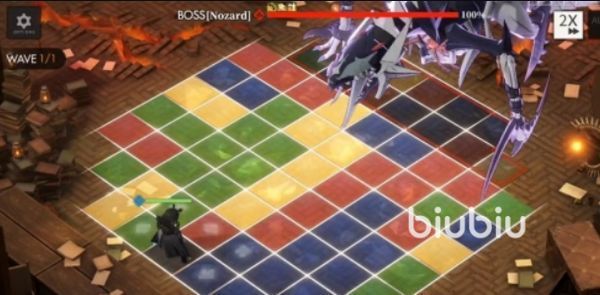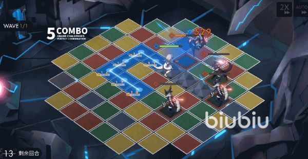 战斗开始时,角色会落在不同的色块上,大家需要控制这些色块上的角色,通过相同颜色的色块来到敌方单位,并与敌方单位进行战斗,角色在前进的时候可以选择周边八格来进行移动,其中会有2到3个与自己脚下同颜色的色块,大家就需要从这两个颜色中进行选择,当角色移动到敌人身边的时候,与所占格子颜色一样的人物就能直接对敌人造成格子倍率白字伤害,与此同时队长还能选择是否对同属性的敌人造成该伤害。总而言之,就是说当大家控制的人物来到敌人相邻的格子的时候,就会直接发起攻击,并且当玩家的行动结束之后,还会根据所行动的总格字来对敌人造成连锁攻击。
