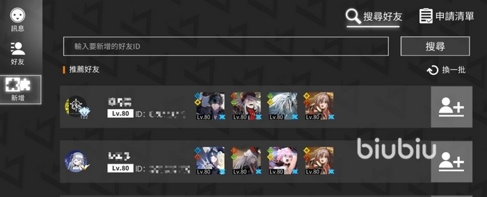 进入该界面左侧有3个选项,分别是消息栏、好友栏、添加好友栏。在添加好友一栏里可以查看来自别人的好友申请,也可以根据用户UID定向添加好友。当然如果你没有一起玩的朋友,那么下面也会有一些推荐好友,会显示该用户的昵称、UID以及可供助战的光灵。