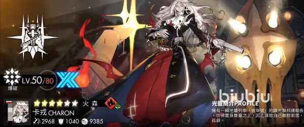 卡戎:他在游戏中是一个六星的火属性角色,副属性为森,初始状态下的攻击达到了3331,防御力达到了1236, HP值为10466,他的职业为爆破,是启光联邦的一名男性角色,他的外在形象是一个白色长发,黑红色长袍的男性,有点像吸血鬼。他的主要攻击技能可以直接任选三横排或者竖排对该线上的所有敌人造成300%的伤害,并且直接将敌人往后击退,该技能的CD比较长,需要三个回合。连锁技能可以直接对周边一格的敌人造成170%的伤害,要是打到12个连锁的话,可以对周边两格的敌人造成180%伤害。装备技能可以让他在普攻的时候并对敌人造成4%的攻击,而且还能无视掉敌人的防御,直接对敌人造成真实伤害。之所以推荐新手玩家使用该角色的主要原因是因为他的攻击范围非常的大,适合前期新手玩家用来刷图,而且还有着可观的输出能力,新手玩家就可以发挥更强的水平。