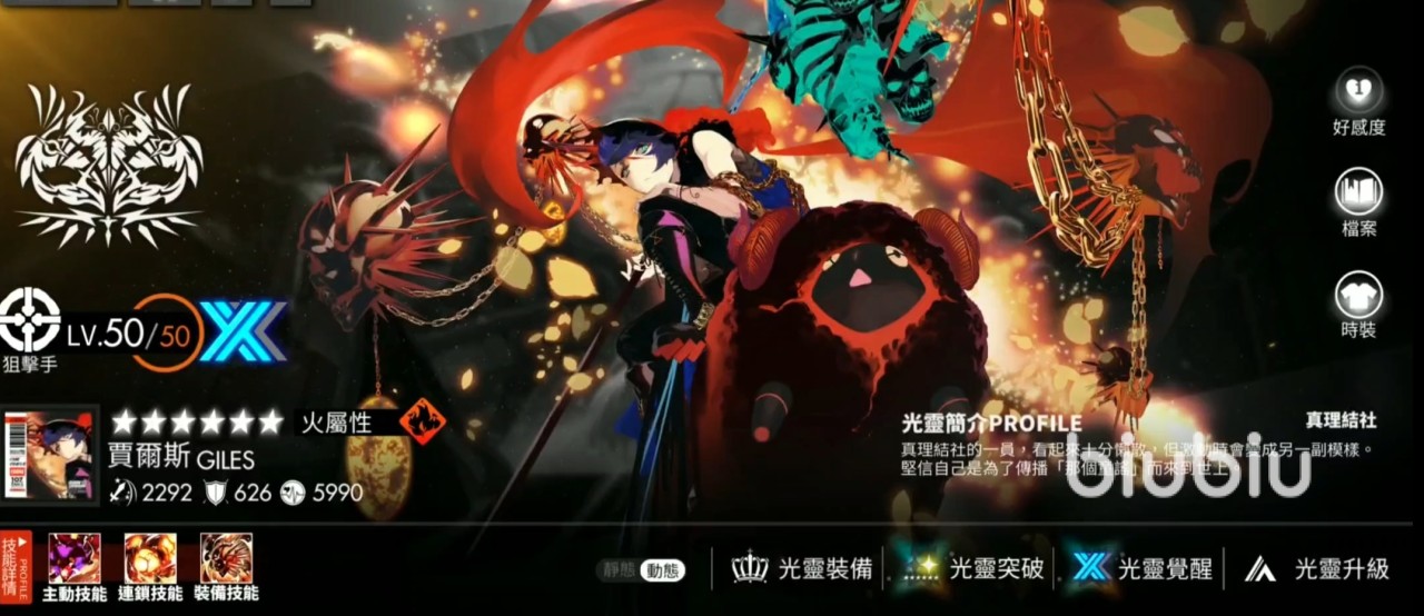 贾尔斯是同样厉害的攻击手,不过与醒山不同的是,他更适合远距离攻击,玩家可以把他当做单体的狙击手进行使用,贾尔斯与醒山的搭配是可以相互弥补的,他的平A技能、连锁技能以及装备技能都有叠加伤害的效果,主动技能【以撒之来】在进阶后,贾尔斯的理智值与伤害都可以翻倍增益。