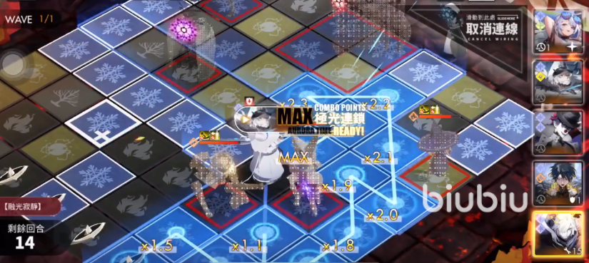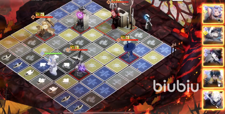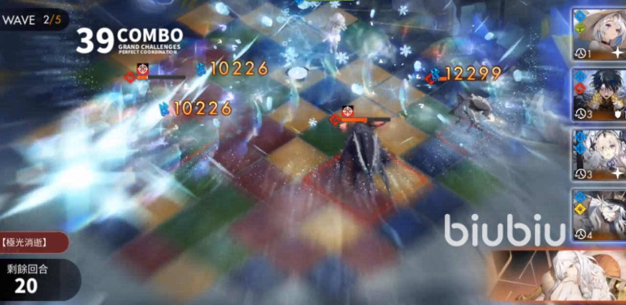 主动技能:幽兰蜃影。任意选择一个可以将队伍途经的格子投射蜃影,每回合可以操作蜃影攻击或者变换格子颜色。每一个回合上场只能存在一个蜃影,多出来的蜃影会被覆盖而且没办法操作。这一个主动技能是青瞳核心技能,蜃影有攻击与转色两种灵活可选的运作方式,在场上水格子少的时候可以选择变色,水格子多的时候使用攻击输出,而且这个技能是零破先制,开局就可以使用。