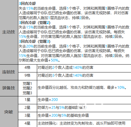 首先是他的主动技,虽然有着3回合的冷却,但是它的效果是十分变态的,他对地方造成的伤害并不是根据自身属性以及倍率来决定的哦,而是根据队伍已损失的生命值来附加伤害,也就是说,队伍血越低,造成的伤害也就越高。同时还会附加“流血”这个超强的debuff,因为流血造成的可是高贵的百分比伤害哦!在面对血越厚的boss,纳尔斯所能发挥的力量也就越强。