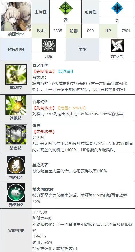 以上就是小编分享的有关白夜极光纳西莉丝阵容搭配推荐,虽然整个森属性的阵容搭配攻击力高,也有尤莱雅这个奶妈给队伍的角色进行血量的恢复,但是这个阵容只在游戏的前期十分厉害,后期就会渐渐变得力不从心,十分拉胯。但是在游戏中对付前期足够了,毕竟强势的角色白夜极光的小伙伴们一下子也抽不齐,后续需要小伙伴们更换星级更高更厉害的角色来代替。