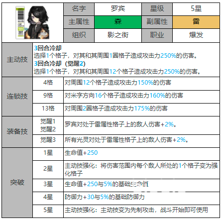 罗宾是白夜极光这个游戏里一个森属性的角色,等级是五星,不算差。在队伍中主要担当输出的角色。尤其有一点,罗宾觉醒之后对雷属性的敌人可以增加2%的伤害。等突破之后到达五星,可以强化技能,将主动技能变成先制攻击,在战斗的一开始就可以使用。
