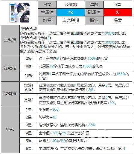 属性介绍:主属性是水,昵称水刀。副属性是火,属于6星爆发角色,需要玩家抽卡获得。在游戏中隶属于启光联邦组织,龙族末裔。角色适合新人玩,在阵容上可以搭配纯水队或者杂色阵容皆可。