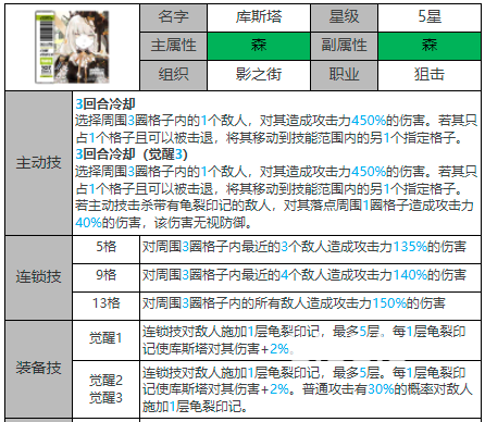 在白夜极光的游戏中,库斯塔是影之街的一个五星森属性光灵,职业是狙击。与可爱娇软的外表不同,库斯塔是一个嘎嘎乱杀有着十足攻击力的光灵。库斯塔的主动技可以对周围三圈格子内的一个敌人进行攻击,若是可以被击退的,则可以移动到范围内的另一个格子。若是小伙伴们到了觉醒三,击杀带有龟裂印记的敌人,除了增加伤害,还可以无视落点周围一圈的防御。