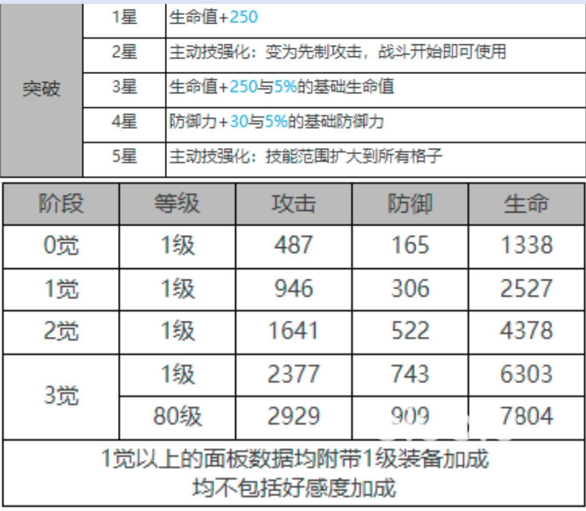 再来看看库斯塔突破的加成,一星的时候增加生命值,二星的时候强化主动技能,变成先制攻击。三星也是增加生命值,四星增加防御。五星就比较厉害了,强化了主动技能,并且技能的范围扩大到了所有的格子。加上库斯塔的生命值通过觉醒增加6000多的数值,综合来说,无论是攻击力还是生命力都是符合预期的,可以入。