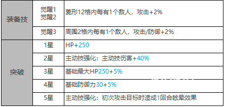 科蒂的装备技能不止可以增加对敌人的伤害,还可以提高自身的防御,当小伙伴们的科蒂到达觉醒3的时候,周围的两格内每有一个敌人就可以增加2%的伤害和2%的防御,此外自身的生命值也会提高7000多的数值。当突破到5星的时候,除了主动技能的强化之外,对局内初次攻击目标还会造成一回合的晕眩效果,算是自带的一个辅助小技能。