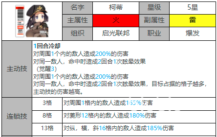 科蒂是白夜极光游戏中的一个五星品质的火属性光灵,职业定位是爆发,组织为启光联邦。科蒂的主动技能是在对局中对周围的一个敌人造成200%的伤害,面对同一敌人命中两回合还会造成一次晕眩效果,并且在对局中,目标所拥有的格子越多科蒂的伤害就越高,加上它的连锁技能到达13格的时候会对较大范围的敌人造成伤害,攻击范围还是可以的,适合搭配转色数量多的队伍,可以增加伤害。
