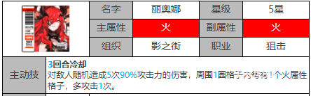 丽奥娜是一个组织为影之街的五星火属性光灵,主副属性都是火,战斗定位是狙击,没有六星火属性狙击光灵的小伙伴可以培养丽奥娜担任队长这个位置。丽奥娜的主动技能可以对敌人造成5次的90%的伤害,并且在攻击范围内周围的一圈格子内每有一个火属性的格子就可以多攻击一次,单看这部分,小伙伴们需要搭配一个能够近距离转色的火属性光灵,最好是具有部分伤害的转换光灵,两者叠加起来会扩大不少攻击值。
