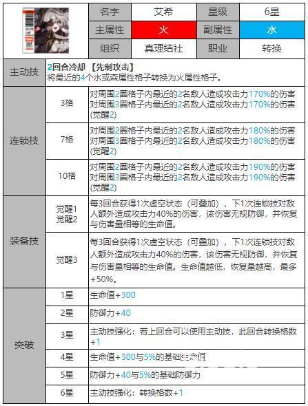 艾希的人物属性,隶属于真理结社的6星火属性角色,昵称是虚空之瞳,玩家们要通过卡池才能获得。