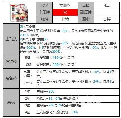 爱丽丝的主动技能可以让玩家的阵容在下一回合少30%的概率的减伤效果,队伍中有人受到攻击伤害的话,也会有10%的恢复效果,减伤效果和恢复效果最大不能超过角色血量上限的2倍。她的面板属性是4星,也是火属性中唯一有奶技能的人物角色了,如果要打造纯色队伍的话就一定要有她了。