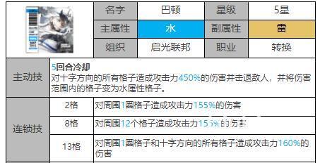 巴顿的自带技能铁颚可以敌人造成4.5倍的伤害并击退敌人,这个敌人是在巴顿自身的十字方向上,攻击范围可以覆盖到最大范围。附带格子转换成水属型,这个主动技能需要5个cd,突破后可以减少到4个cd,那么在阵容上就需要给巴顿找一个输出高的搭档。