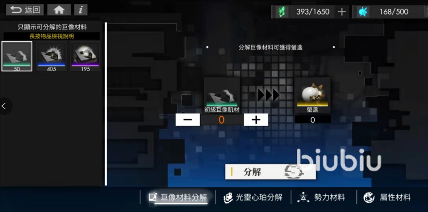 之后则是当玩家们解锁了巨像中的冶炼室后,玩家们可以在巨像材料分解这一栏中,把溢出的材料给换成荧盏,初级的材料可以兑换一点,中级的可以兑换两点,最高级的则可以兑换8点,急缺荧盏的小伙伴可以考虑使用这个方法。