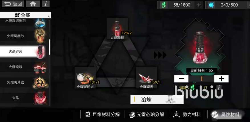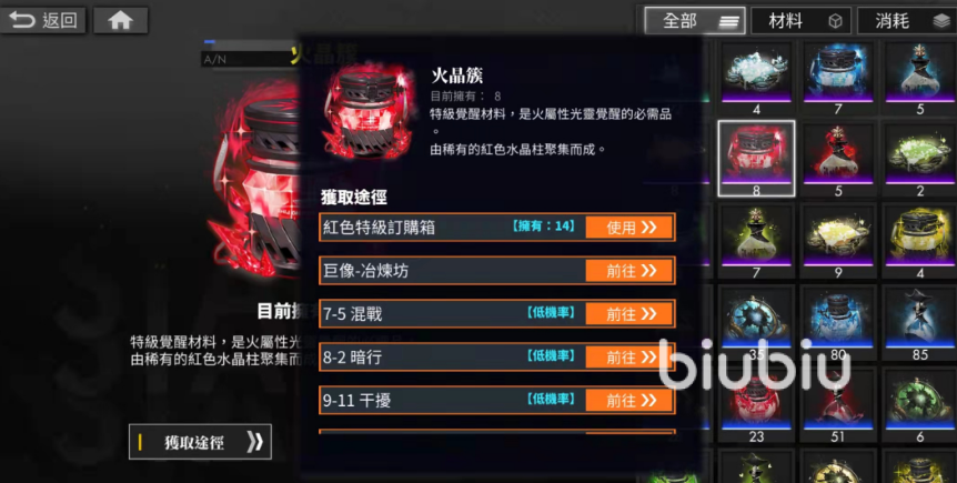 首先是属性觉醒材料,仲胥一破时需要的觉醒材料为初级的火辉煌素以及火耀斑粉尘,这两者的获取渠道都不难,在关卡1-9就有固定掉落,不过这样刷的话性价比极低,玩家们可以在构建了火属性队伍后前去挑战超熔尖塔,基本上过了一层就会奖励玩家们10个火辉煌素,用来突破一破绰绰有余。但是三破的时候需要的火晶簇就十分难刷了,只有7-5以及8-2等关卡会有很小的概率掉落,不过玩家们可以依靠巨像的合成系统进行合成,这样可以加快玩家们的收集速度。