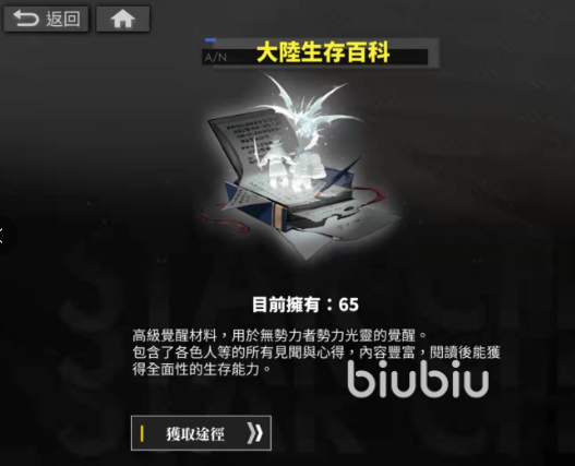 之后则是觉醒材料,相比于属性觉醒材料,势力觉醒材料并不难获得。因为目前官方并没有为龙洲势力单独出阵营的单算,所以仲胥的势力觉醒材料为“大陆生存百科”,玩家们只需要多刷一刷淬线启光副本就会大量掉落。