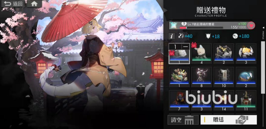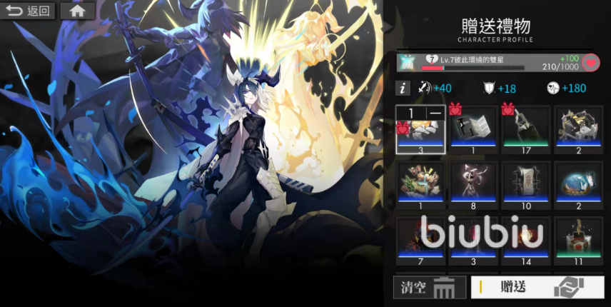 礼物则是玩家们用来提升光灵好感度的道具,提升了光灵好感度后,除了有很大概率可以触发光灵的个人剧情之外,还可以提升光灵的攻击力防御力以及生命值哦!而且满级好感之后可以足足提升50点,相比于升级带来的属性提升也是不遑多让了。