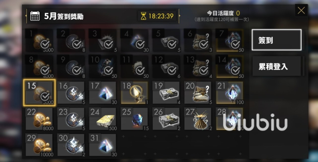 如果时间允许的话也是要尽量把当天的活跃度任务刷到120点,这样会增加额外一次签到次数,用来补签。这里也顺带说说签到,根据当月有多少年来算,通常1个月也是能给到2~300的光珀,还有各种材料。