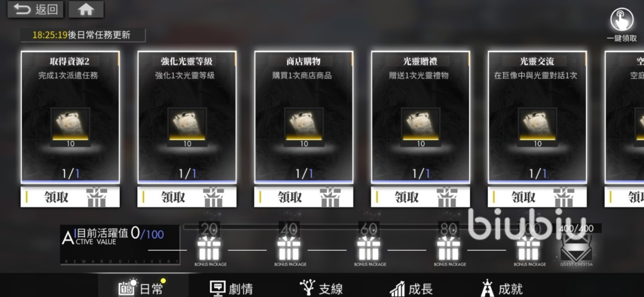 除了光珀,每日的任务中还能得到一点白夜币和几个礼包袋子,后者是随机得到一些光灵喜欢的礼物,送给对应的光灵提升好感度,解锁更多剧情、语音以及与面板属性挂钩的项目。