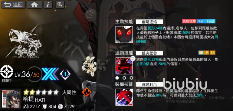 而二破之后玩家们可以对主动技能进行蓄力,蓄力之后,下一回合哈提的主动技能可以造成两倍的伤害,位移的范围也会增加,这个提升较为中规中矩,但是哈提三破之后就十分恐怖了。哈提的三破可以造成十字型的范围伤害,这个技能可以很好地弥补狙击属性带来的群攻不足的缺点,可以说,哈提一旦三破了,是可以当做爆破职业的光灵来使用的。