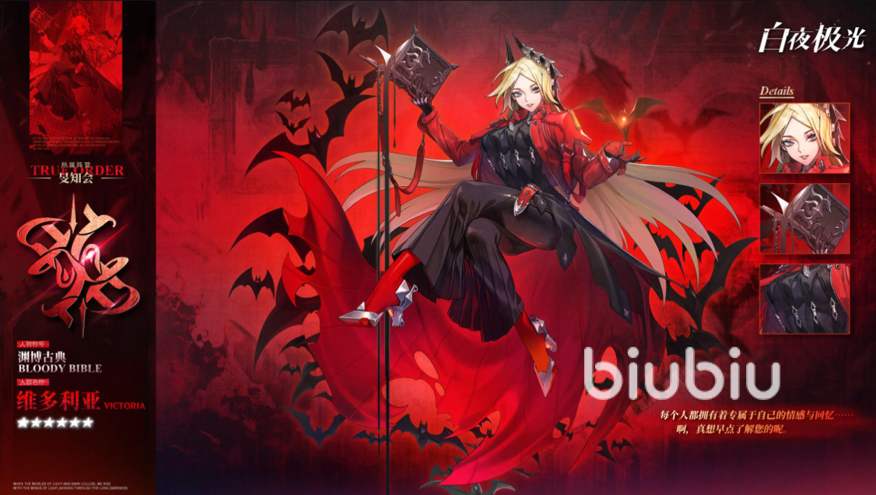 维多利亚的技能和卡戎几乎一致,但是大绝只是单体伤害,相对弱一些,好处是有吸血的效果,可以大幅提升续航能力,还可以有目的地击杀指定目标。突破一的时候技能的吸血量增加,满突破会大幅增加清理小怪的能力,但没必要强求,毕竟泛用性并不是特别高。