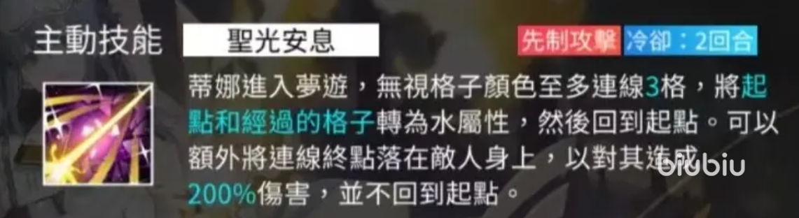 此游中的蒂娜并非是主要的输出人员,所以在搭配与其相关的队伍时,就要在队伍中添加上有强劲输出能力的人物。而这个角色的主动技能效果是可以转色,不过她的转色方式是通过连线。