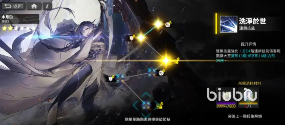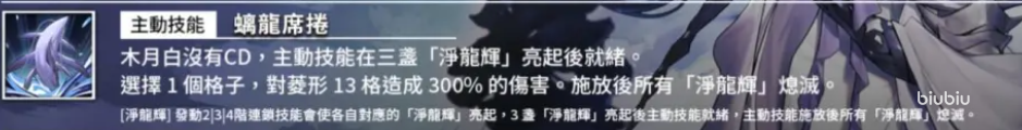 连锁方面,不同于其他角色,木月白本身的连锁技能有四个阶段,在连锁到三的时候就已经能触发第一阶段的160%比例的范围伤害了,此外,234阶段去打一些2×2体型的怪物有奇效,可以将伤害完全打满,触发之后输出相当可观。如果说在触发了净龙辉的话,那么伤害还会进一步提高。
