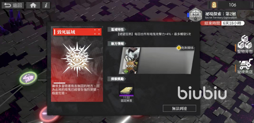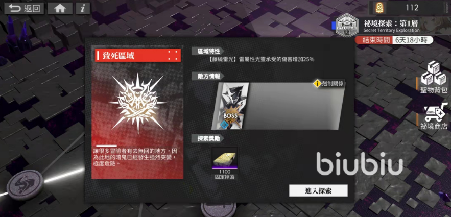 秘境探索作为这款游戏独有的“肉鸽”玩法,每一次玩家们不同的选择都会即时的影响自身的战力,同时,每一场战斗打完,玩家们都可以选择不同的圣物来提升战斗力。而秘境探索一共有五层,每一层最后都会有一个boss,需要击败boss玩家们才可以前往下一层,而boss所在的区域就叫“致死区域”。