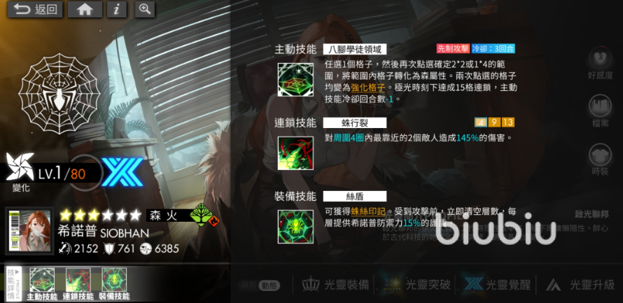 由于作为转射位和辅助位的性质,蜘蛛在队伍中,其辅助能力相当不错。特别是森林属性队伍中为队伍争取更多的输出。可以说,在原有的森林强化体系当中,更加进行了优化。可以代替部分队伍中的奶妈位置作为辅助或者转色,甚至于还可以作为护盾角色使用。