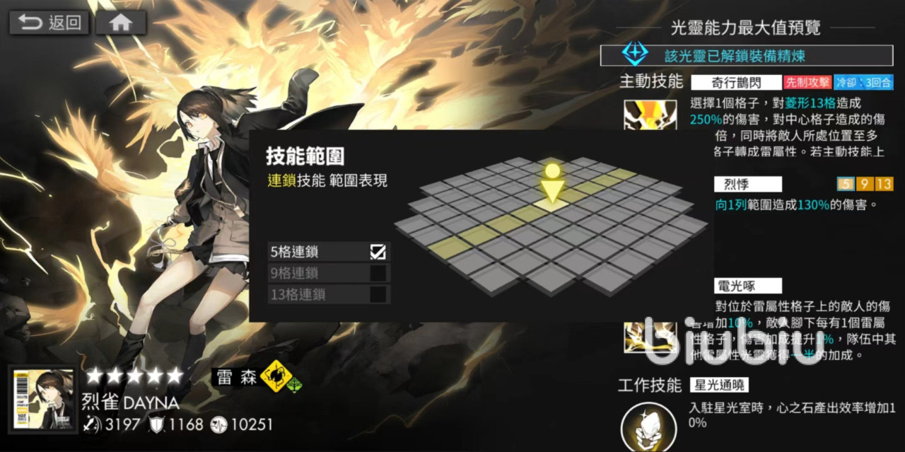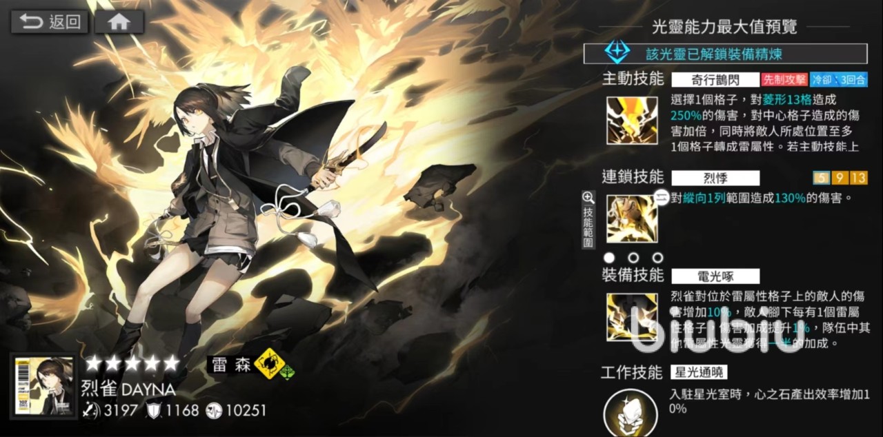 烈雀攻击位于雷格子上的敌人增加2%伤害。升到三觉,烈雀可以提升所有出战成员对位于雷格子上的敌人的伤害。