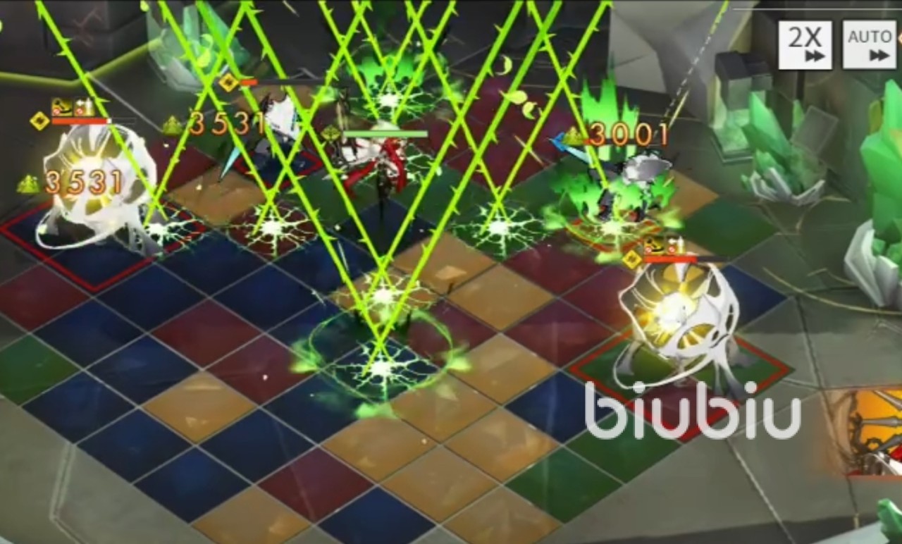 连锁技“影棘”,四倍:对周身2圈的3个敌人造成攻击力165%的伤害;八倍:对周身圈的3个敌人造成攻击力170%的伤害;十二倍:对周身3圈的4个敌人造成攻击力180%的伤害。最多可对4个敌方单位造成伤害,在面对多个小怪会有不错的表现。