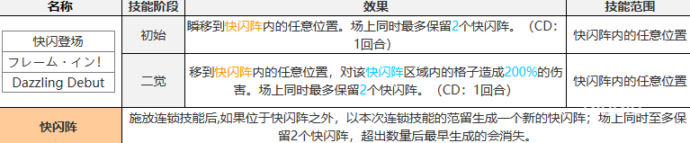 首先就是她的主动技能,莉莉卡的主动技能名为“快闪登场”,在使用这个技能后,玩家们可以直接创造出一个可以供玩家们进行位移的快闪阵,当莉莉卡位移的时候还可以造成高达200倍率的伤害。很多玩家们在进行游戏的时候,不知道的是,莉莉卡的连锁技能也是可以创造出一个快闪阵的哦,当莉莉卡的连锁达到12次之后,就可以创造出一个棱形12格的快闪阵,可以对大体形的敌人造成巨额伤害。