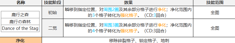 首先就是他的主动技能“鹿行之森”了,这个技能除了拥有优秀的位移之外,最为关键的就是可以净化效果以及生成强化格了,前者可以直接移除地刺,碎裂格子等各式各样的格子Debuff,在面对部分高难本,如癫蹄时有奇效。